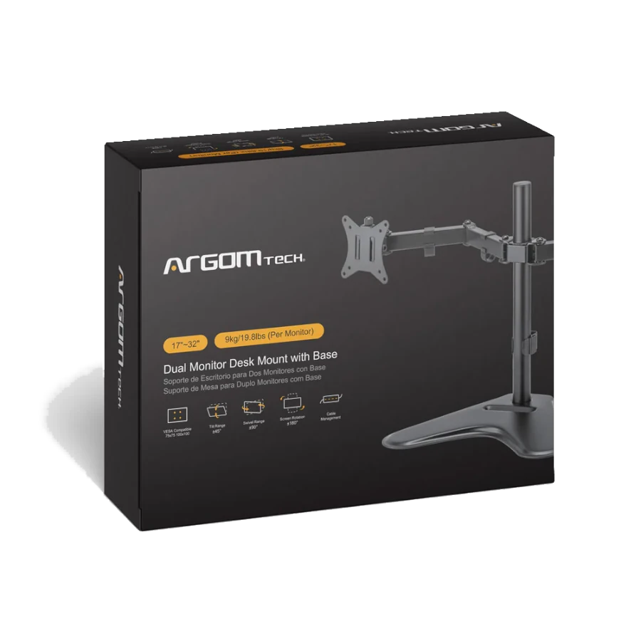 Maximiza tu productividad con esta base de escritorio Argom para doble monitor (17 a 32). Su abrazadera de movimiento completo permite inclinar, girar y rotar 180° ambos monitores, ofreciendo una vista óptima y sin herramientas. Con capacidad de 9 kg por monitor, es el compañero ideal para el hogar o la oficina y ayuda a ocultar los cables antiestéticos.