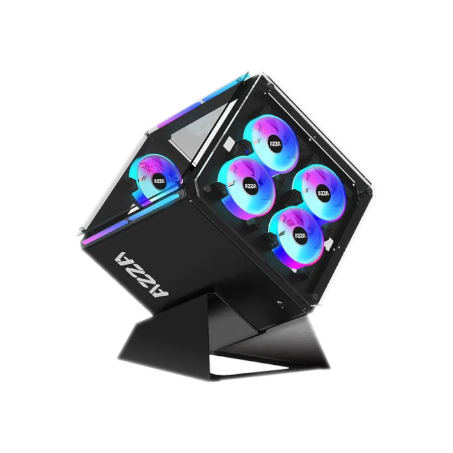 Azza 802F Cube: Diseño Cubista Revolucionario. Caja ATX tipo cabina negra con triple panel de vidrio templado y detalles RGB. Doble cámara para enfriamiento superior y gestión de cables. Incluye 5 ventiladores ARGB y soporte para GPU de hasta 320 mm. ¡Destaca con un estilo único!