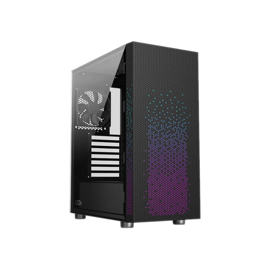 Azza Celesta 340F: Torre Gaming ATX con Frontal Estelar. Diseño único con malla guía de luz para un efecto deslumbrante. Amplio espacio interior, panel lateral de vidrio templado y 3 puertos USB. Ventilación optimizada con filtros antipolvo.