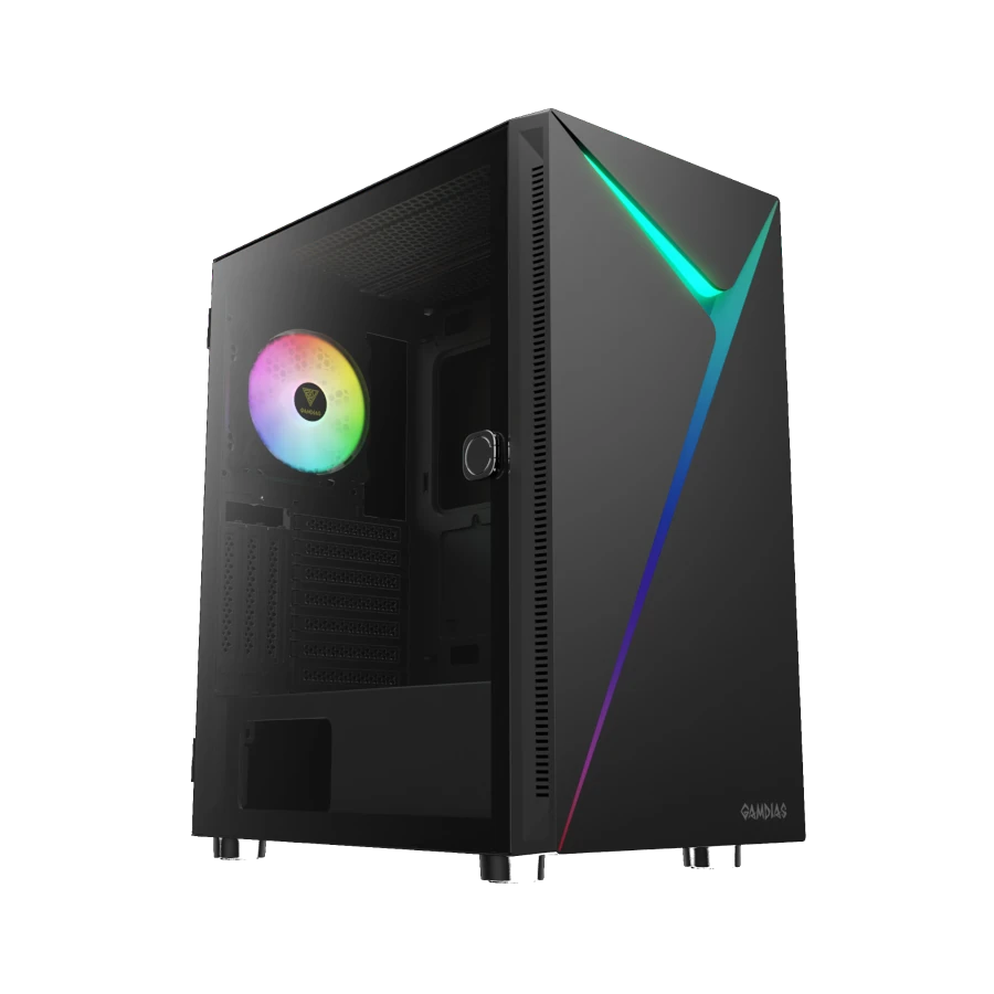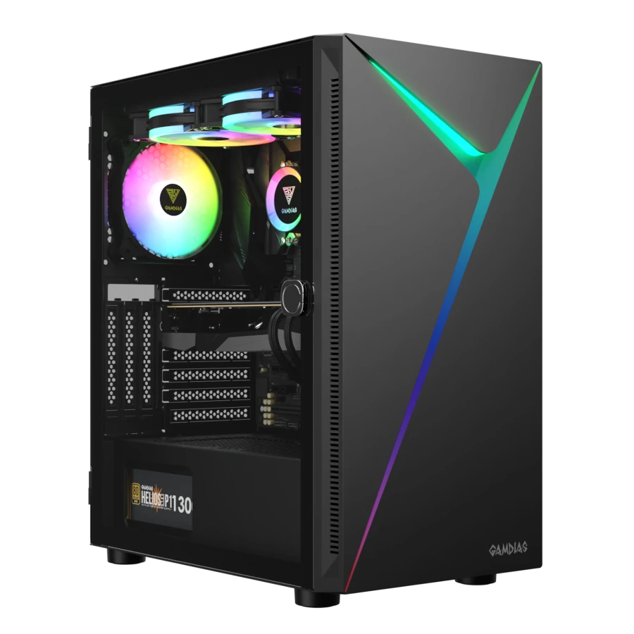 Gamdias Argus E4 Elite: Innovación y Estilo ARGB. Diseño moderno con panel frontal único e iluminación RGB fluida. Puerta lateral de vidrio templado para exhibir tu construcción. Amplio espacio interno y sincronización ARGB con la placa madre.