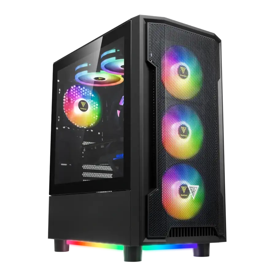 Gamdias Athena M6 Lite: Brillo ARGB y Flujo de Aire Óptimo. Panel frontal de malla y chasis perforado para máxima ventilación. Incluye 4 ventiladores ARGB y underglow de tres lados. Diseño moderno con ventana de vidrio templado y sincronización con placa madre.