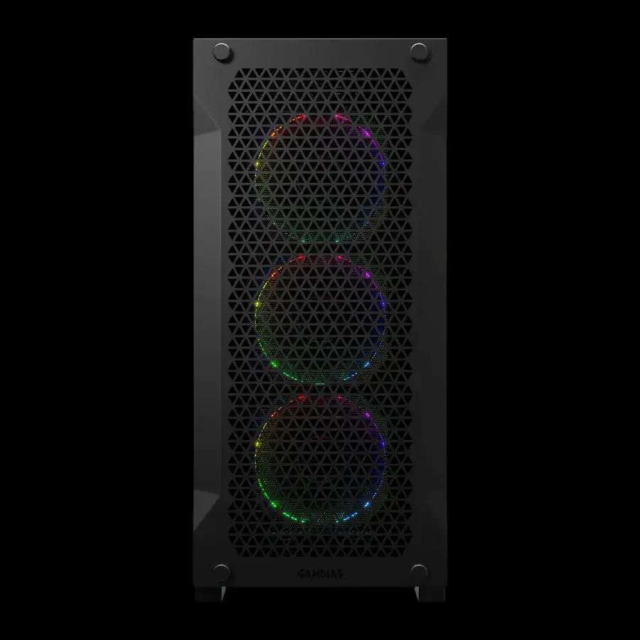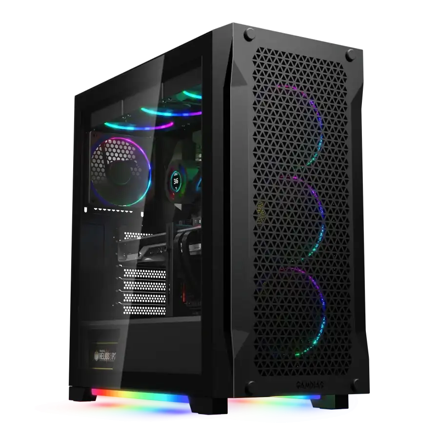 Gamdias Athena P1: Flujo de Aire Premium y ARGB Vibrante. Panel frontal de malla para refrigeración superior. Incluye 4 ventiladores ARGB y underglow de tres lados. Amplio espacio interno con gestión de cables optimizada y soporte para GPU de gran tamaño.