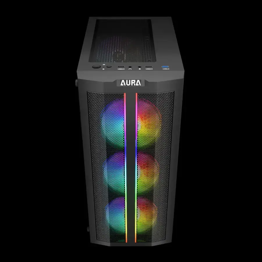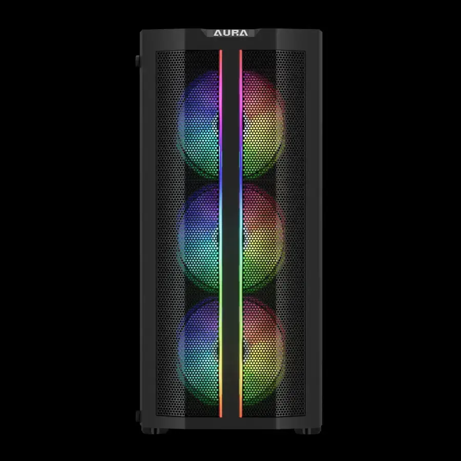 Gamdias Aura CG3 ELITE: Torre Gaming RGB con Panel Frontal Distintivo. Diseño de doble tira de luz RGB, malla frontal y 4 ventiladores RGB fijos. Ventana de vidrio templado y soporte ATX. ¡Estilo y ventilación que marcan la diferencia!