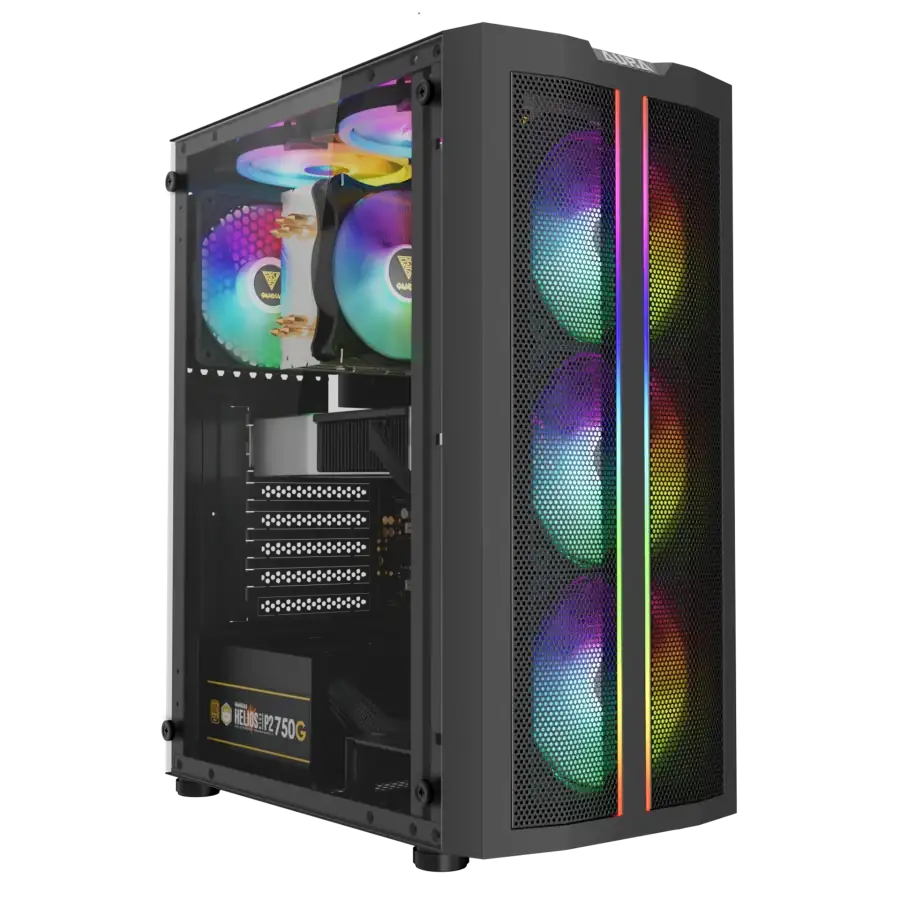 El Gamdias Aura CG3 ELITE es un gabinete semitorre que destaca por su panel frontal de malla único, adornado con dos elegantes tiras de luz RGB. Esta combinación no solo asegura un flujo de aire excepcional para mantener tus componentes frescos, sino que también añade un toque de estilo inigualable a tu configuración gaming, complementado por cuatro ventiladores RGB fijos preinstalados.