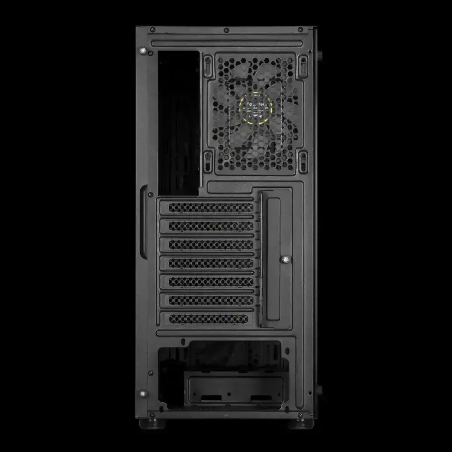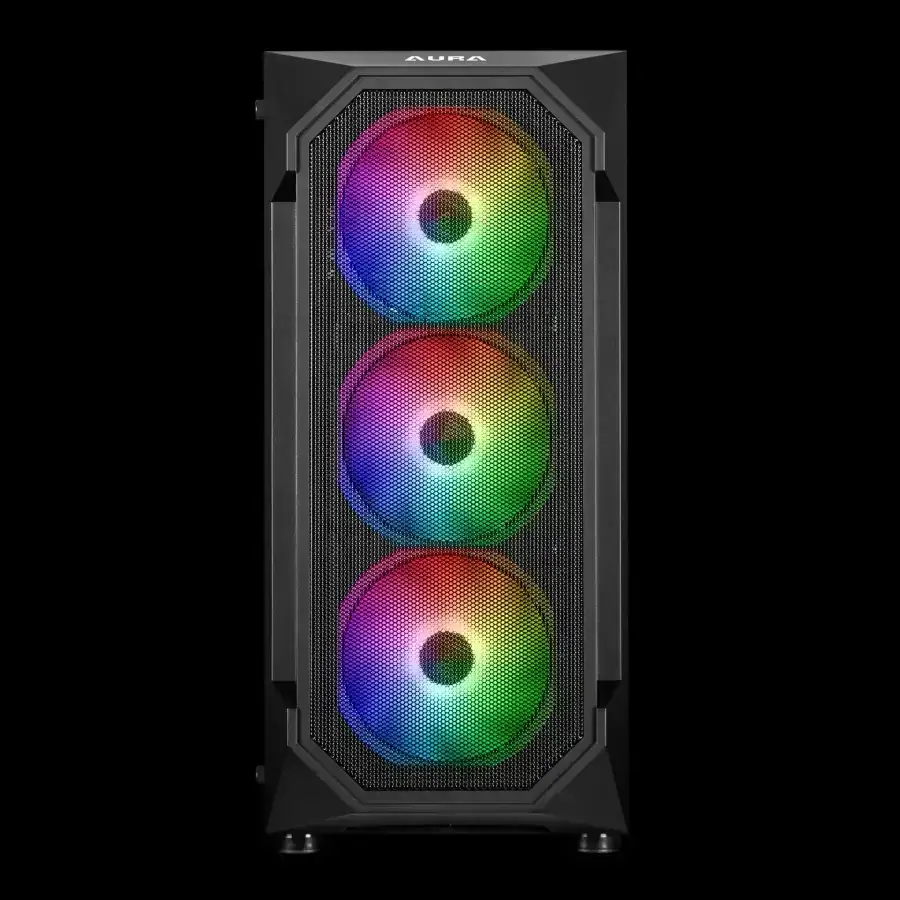 El Aura GC1 viene equipado con cuatro ventiladores ARGB de 120 mm integrados, tres en la parte frontal y uno en la parte trasera. Estos ventiladores no solo proporcionan una excelente refrigeración, sino que también ofrecen un espectáculo de luces vibrante que se exhibe a través del panel frontal de malla y el panel lateral panorámico de vidrio templado.