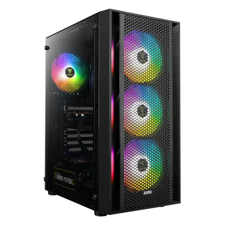 Gamdias Aura GC2 Negro: Semitorre ARGB Perforada para Máximo Flujo de Aire. Panel frontal biselado con ventilación optimizada. Incluye 4 ventiladores ARGB sincronizables. Ventana de vidrio templado sin herramientas. Soporta hasta ATX.