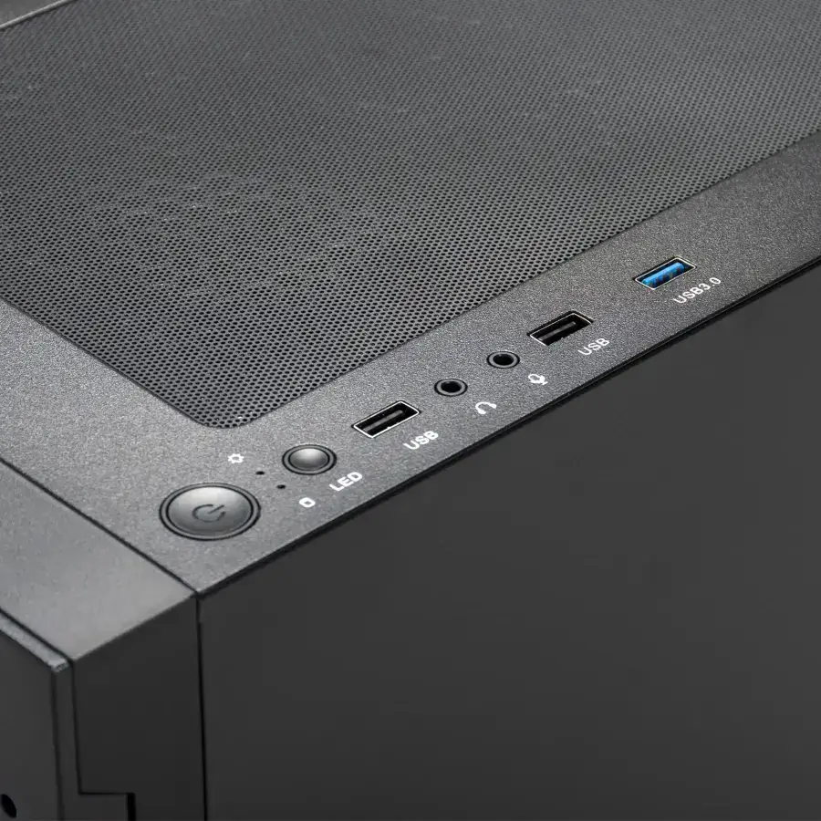 A pesar de su tamaño compacto, el Talos E3 Mesh Negro ofrece una gran flexibilidad para construir tu sistema ideal. Es compatible con placas base hasta ATX y tarjetas gráficas de hasta 300mm de longitud. Su diseño interior inteligente incluye una cubierta para la fuente de alimentación que ayuda a ocultar los cables y mejorar el flujo de aire, facilitando un ensamblaje limpio y organizado.