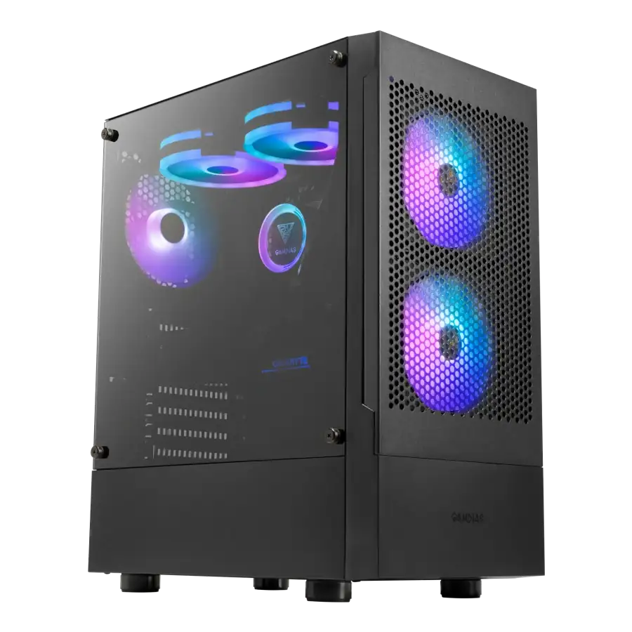 Gamdias Talos E3 Mesh Negro: Ventilación Extrema y Estilo ARGB. Panel frontal de malla de 5.0mm para un flujo de aire superior. Incluye 3 ventiladores ARGB sincronizables. Lateral de vidrio templado y diseño compacto ATX con gestión de cables.