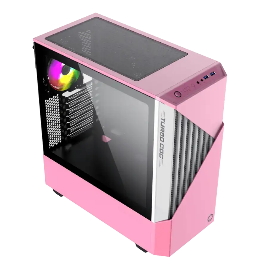 Case Gamemax Contac Coc WP: Torre Midi ATX blanca y rosada con panel lateral de vidrio templado. Incluye ventiladores ARGB frontales y traseros, además de un innovador sistema de enfriamiento COC para un rendimiento óptimo. Control de iluminación ARGB y ventiladores mediante hub PWM+Rainbow V2.0. ¡Estilo y refrigeración avanzada para tu setup gaming!