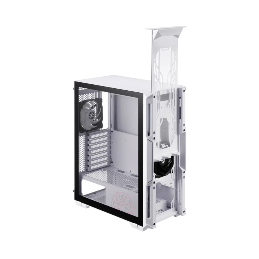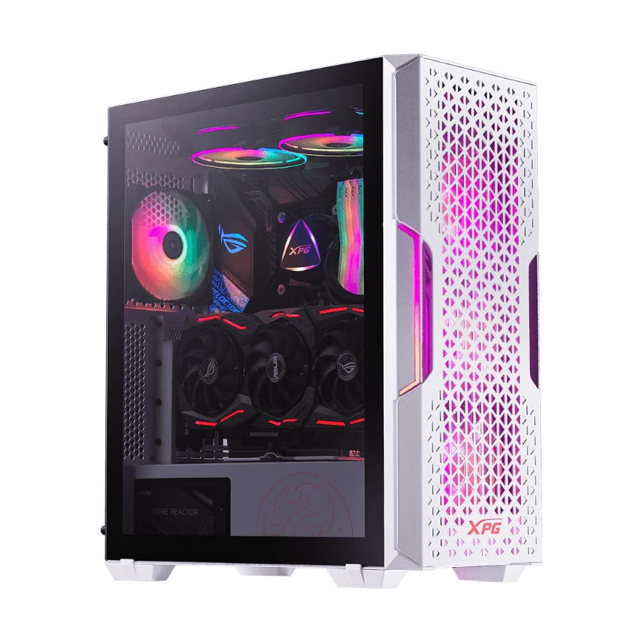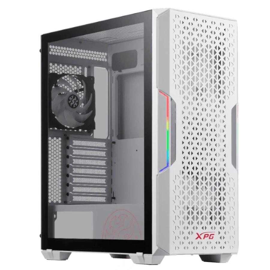 XPG Starker Air Blanco: Ventilación Superior y Estilo ARGB. Torre media ATX blanca con panel frontal de malla magnética para máximo flujo de aire y tiras ARGB. Filtro antipolvo deslizante, soporte VGA vertical/horizontal y 2 x USB 3.0.