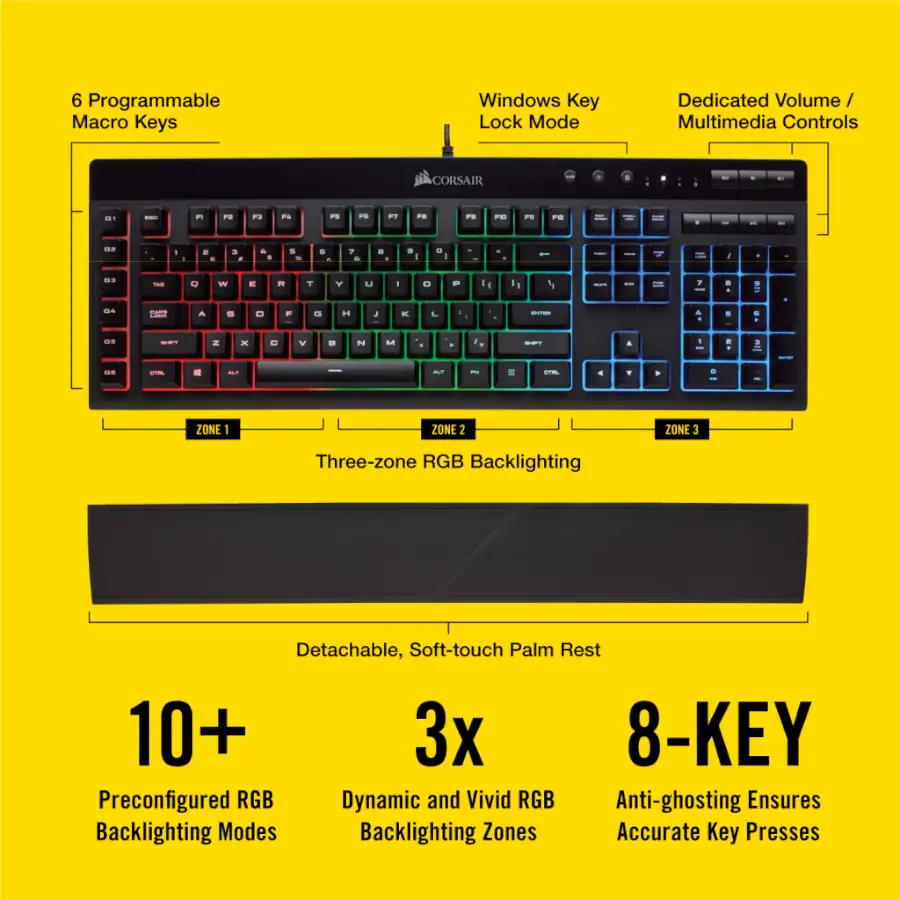 El K55 Pro incluye un reposamuñecas extraíble, diseñado para proporcionar la máxima comodidad durante largas sesiones de juego. Además, cuenta con controles multimedia y de volumen dedicados, permitiéndote ajustar el audio o cambiar de canción sin salir de la acción. La tecla de bloqueo WIN dedicada evita interrupciones accidentales durante tus partidas más intensas.