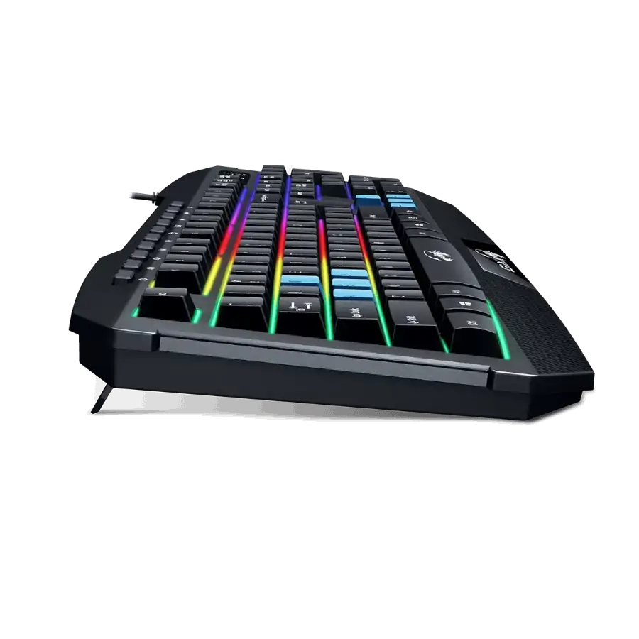 Ilumina tus partidas con este **teclado gaming RGB de 7 colores**. Disfruta de **teclas cóncavas duraderas** con 2 millones de pulsaciones y 10 accesos multimedia para un control rápido. Su **diseño resistente a derrames** lo hace ideal para cualquier gamer.